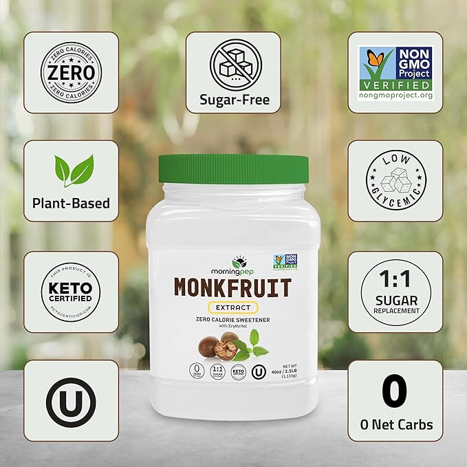Morning Pep 100% Pure Monk Fruit extract sweetener, No Erythritol, Monkfruit Extract Powder, NON-GMO Project Verified, Keto Certified, OU kosher, No Fillers Zero Calories